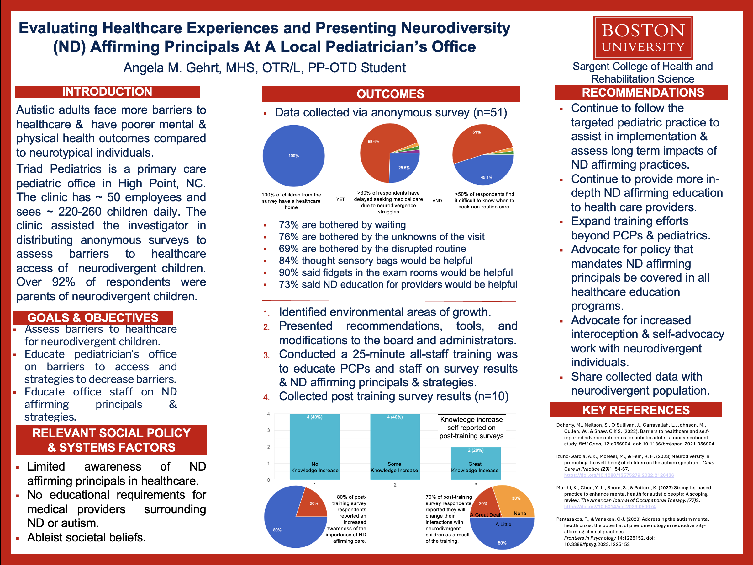Neurodiversity affirming practices are for everyone! The term “neurodiversity affirming” practice is indeed gaining popularity in the pediatric world, but its importance and relevance are not limited to pediatric settings. This course will provide practitioners with a basic understanding of the neurodiversity paradigm and current best practices regarding neurodiversity affirming principles. Additionally, practitioners will gain an increased understanding of why utilizing neurodiversity affirming principles across all settings is imperative through alarming statistics and qualitative feedback. Advocacy skills will be built by exploring strategies to decrease barriers to healthcare access for neurodivergent individuals and improve occupational justice. Again, quantitative and qualitative data will be presented to show the efficacy and impact of a short-term neurodiversity advocacy program.